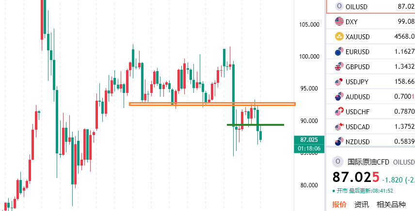原油方面,随着中东局势有望进入谈判阶段,而且伊朗有意对交战国以外其他国家开放霍尔木兹海峡,短期原油供应的担忧情绪有所下降,如果后续战火能平息,还有进一步降温的预期,原油也是如期走出了回落,上个交易日晚间分享的反弹93附近做空的思路是完美兑现到了87一线目标位,短期这个情绪有望延续,操作上继续保持反弹空的节奏即可。