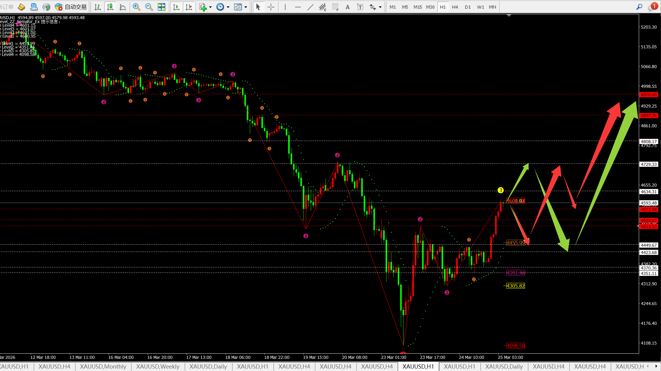 从4小时图可以明显得出支撑阻力的分布:支撑分布4300-4320-4350-4380以及4410一线;而阻力分布4600-4700-4734以及0.50分割位4758一线。其上方的压制点4910-4970是明后天该考虑的,今日天成认为上涨大概率在4730-4758附近。