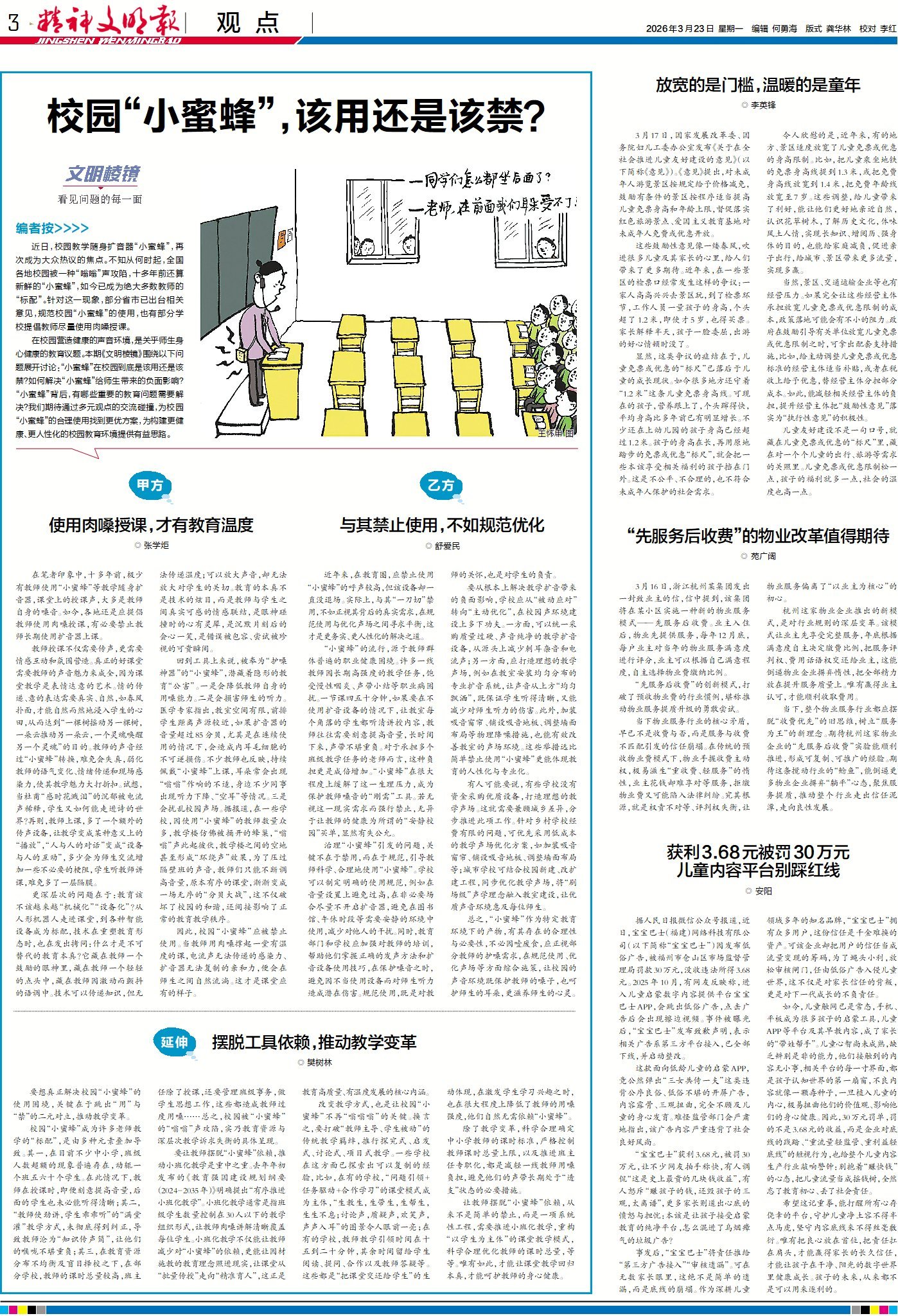 在校园营造健康的声音环境,是关乎师生身心健康的教育议题。本期《文明棱镜》围绕以下问题展开讨论:“小蜜蜂”在校园到底是该用还是该禁?如何解决“小蜜蜂”给师生带来的负面影响?“小蜜蜂”背后,有哪些重要的教育问题需要解决?我们期待通过多元观点的交流碰撞,为校园“小蜜蜂”的合理使用找到更优方案,为构建更健康、更人性化的校园教育环境提供有益思路。