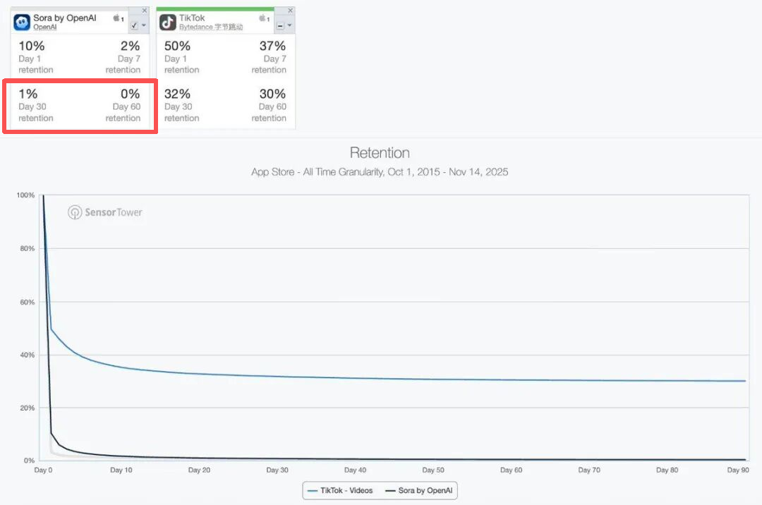 图上显示,Sora的30天留存率仅为1%,60天留存率直接归零。