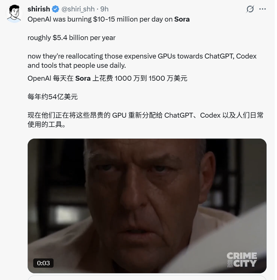 去年Sora 2独立应用发布时,上线不到5天下载量就突破100万,曾冲到苹果App下载量第一,可以说风头无两。仅仅过了6个月,怎么就匆匆下线了呢? 最主要的原因是,Sora烧钱太快,却看不到什么“钱”景。 作为一个视频生成工具,Sora是个消耗算力的“无底洞”。以一个10秒的视频为例,Sora需要的算力大约是一次复杂ChatGPT查询的数千倍。 关键Sora的模型性能还不怎么样。很多测评博主表示,Sora生成的视频中,真正达到可发布水准的仅占5%到10%。也就是说,抽10次卡,只有1次是能用的,抽多了还要排队,要抽出几秒钟能用的视频,得花上半个小时。这种算力和时间成本,收费使用的话,用户扛不住,免费使用呢,OpenAI扛不住。