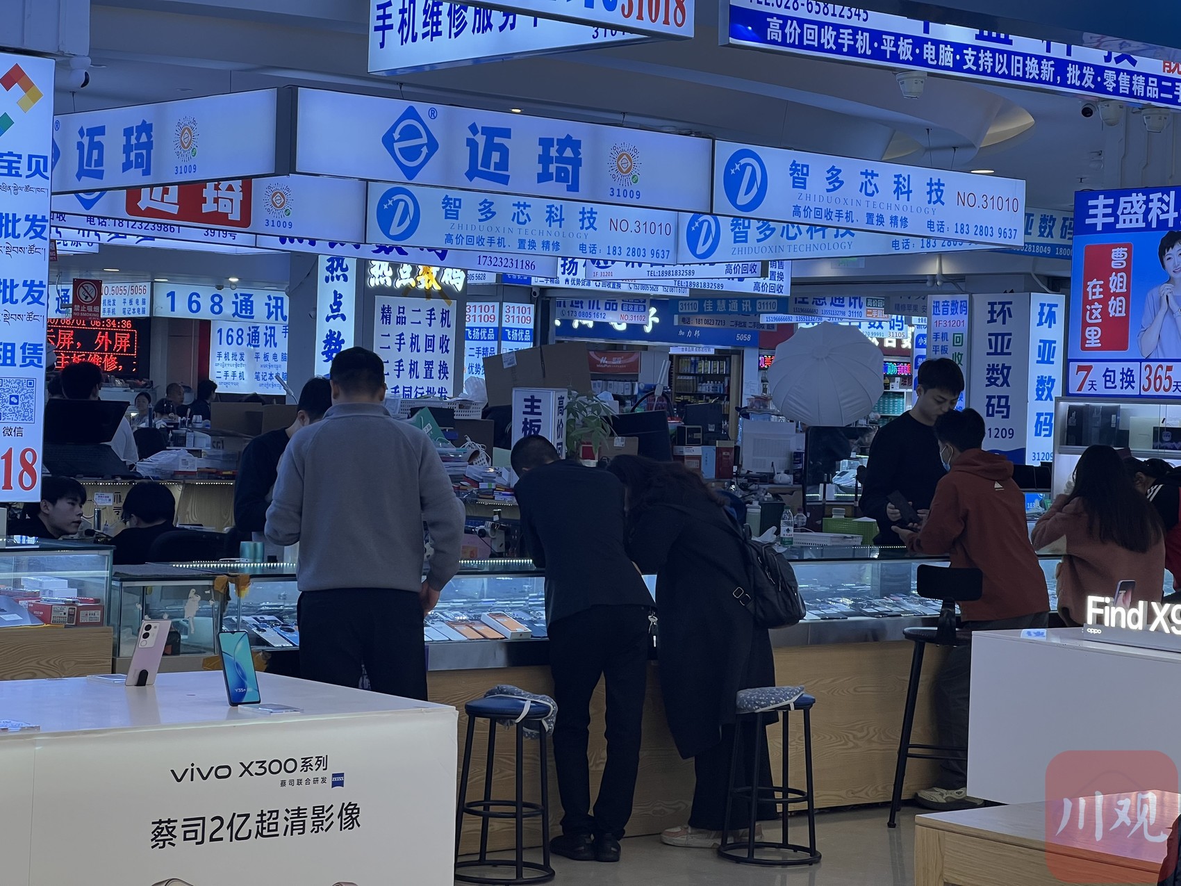 在成都太升南路赛格广场,多家手机回收店铺前围着前来出售、购买二手手机的市民。
