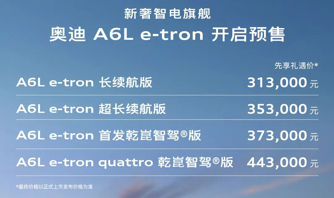 一汽奥迪销售有限责任公司执行副总经理郭永锋在现场宣布了新车的正式售价:32.29万元-43.59万元,同步开启预售的奥迪A6Le-tron预售价格为31.3万元-44.3万元,多重上市权益也一并推出。
