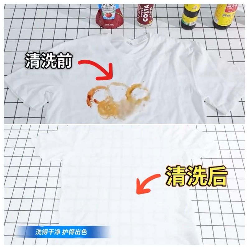 我们直接挑战“重口味”顽固污渍:在白色衣物上涂抹酱油、咖啡等顽固污渍,放入内筒检验洗净效果。清洗后的效果一目了然,常见顽固污渍一次洗净,没有任何污渍残留,衣服白得像张纸一般,护色效果不得不服。