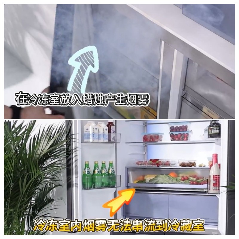 另外,我们还测试了冰箱的独立双系统效果。在冷冻室放入烟饼,等烟雾充分弥漫后关紧门,大家可以清楚看到,冷藏室里始终干干净净,一丝烟雾都没有飘进来,这证明冰箱的双系统配置确实出色,以后冷冻的鱼虾肉、冷藏的熟食、水果将彻底避免串味的困扰了。