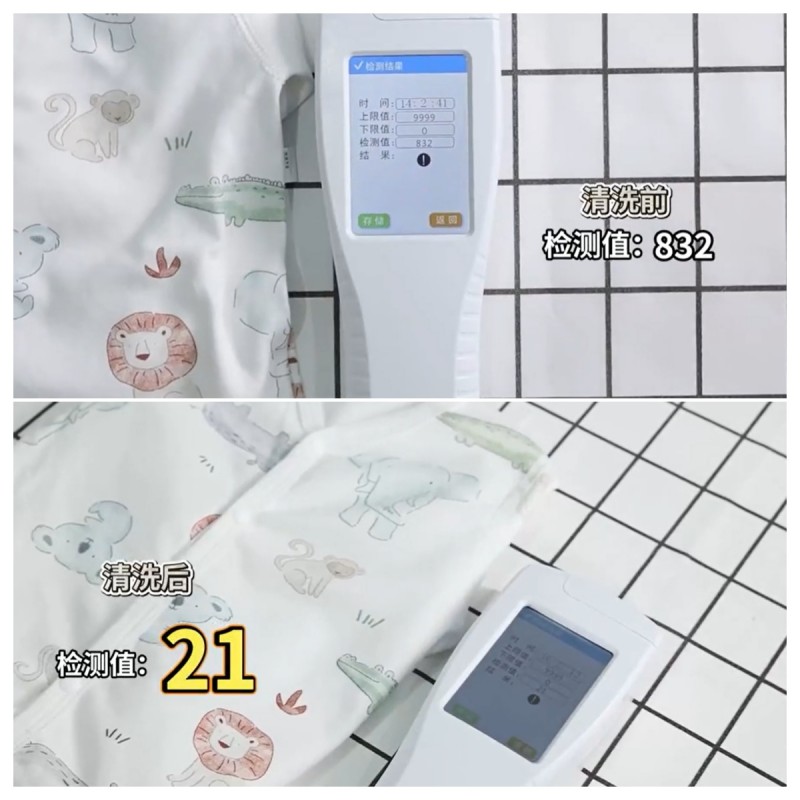 我们先选取了沾有日常污渍的纯棉衣物,用ATP荧光检测仪先测初始细菌数值:测试前数值为832,代表细菌含量较高。随后将衣物放入本色2026洗烘套装,用它的“本色健康筒”进行洗涤。洗完烘干后再次检测,ATP荧光数值直接降到21,除菌效果肉眼可见。