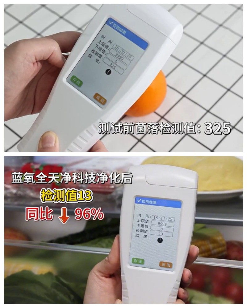我们先对果蔬表面进行了拭子采样,初始菌值为325,然后将它放入小天鹅本色冰箱601里,放置2小时经蓝氧全天净科技净化后,在同一位置再检测,能看到菌值下降为13,这个变化很显著。