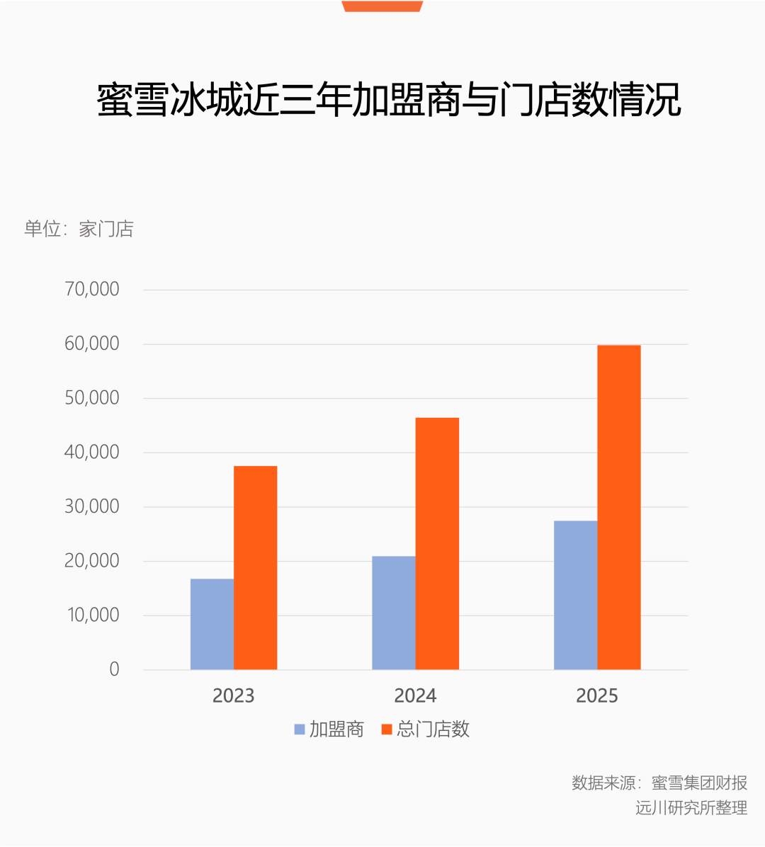 与回本周期挂钩的加盟意愿相对难以衡量。按照财报的口径,蜜雪冰城近6万家门店只对应2万多加盟商,也就是说,大部分加盟商开了至少两三家店。2025年,蜜雪冰城“全年净新增6474名加盟商”,已经超过了很多品牌的门店存量,从侧面反映出比较强的加盟吸引力。