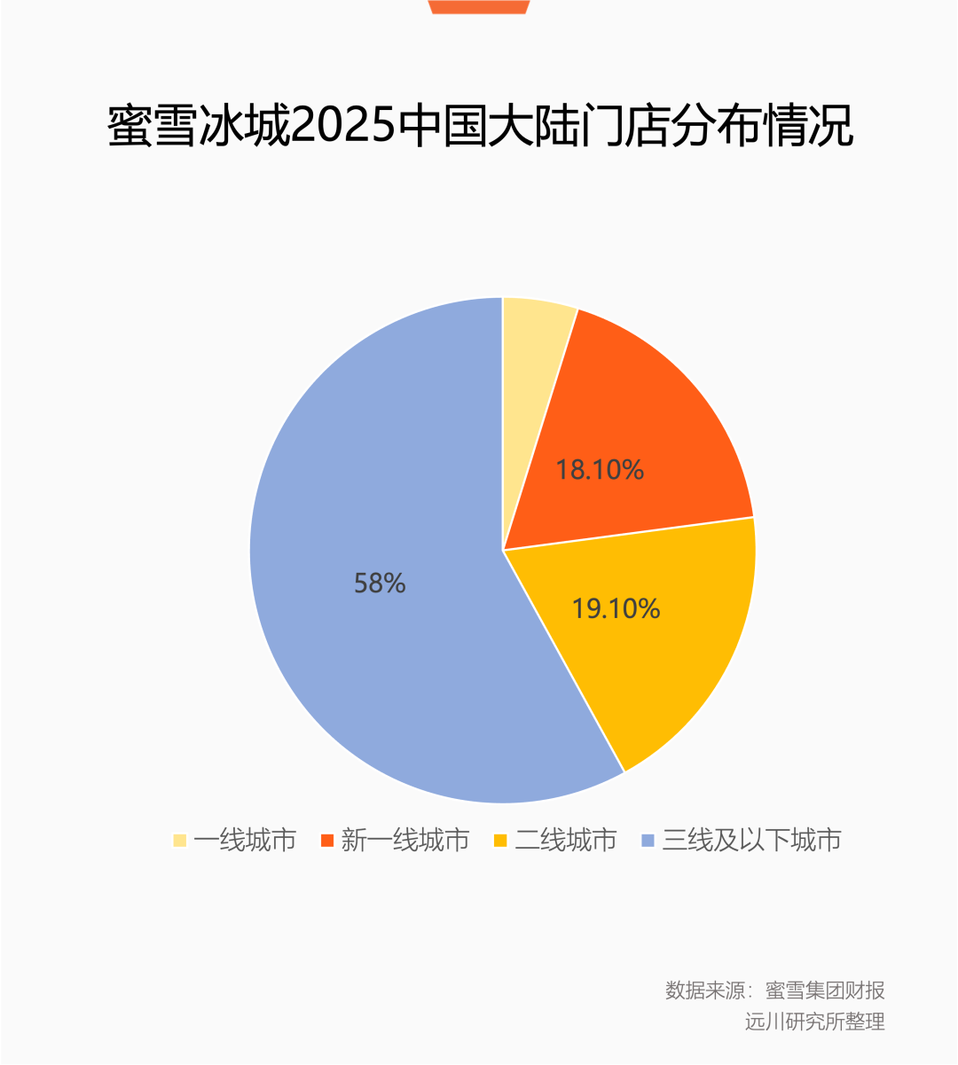按照财报口径,蜜雪在三线及以下城市有3万多家门店,占中国大陆门店的58%[1]。仅2025年一年,蜜雪旗下三个品牌在下沉市场就净增了8261家门店。