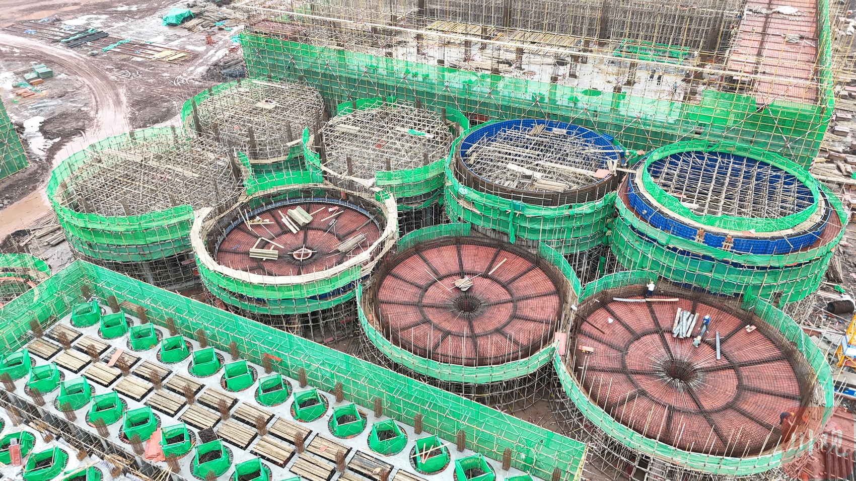 走进项目现场,两个褐色高大圆柱体撞入眼球,多个施工点闪烁着焊接作业产生的白光。舒奇说,圆柱体是硫黄、硫酸存储罐,是项目的大型设备之一,总共建设8个,每个高17.2米、直径19米,分别能装1万吨,采用倒装式施工,先做罐顶、再从上往下做罐身、最后与罐底板焊接,施工效率更高。