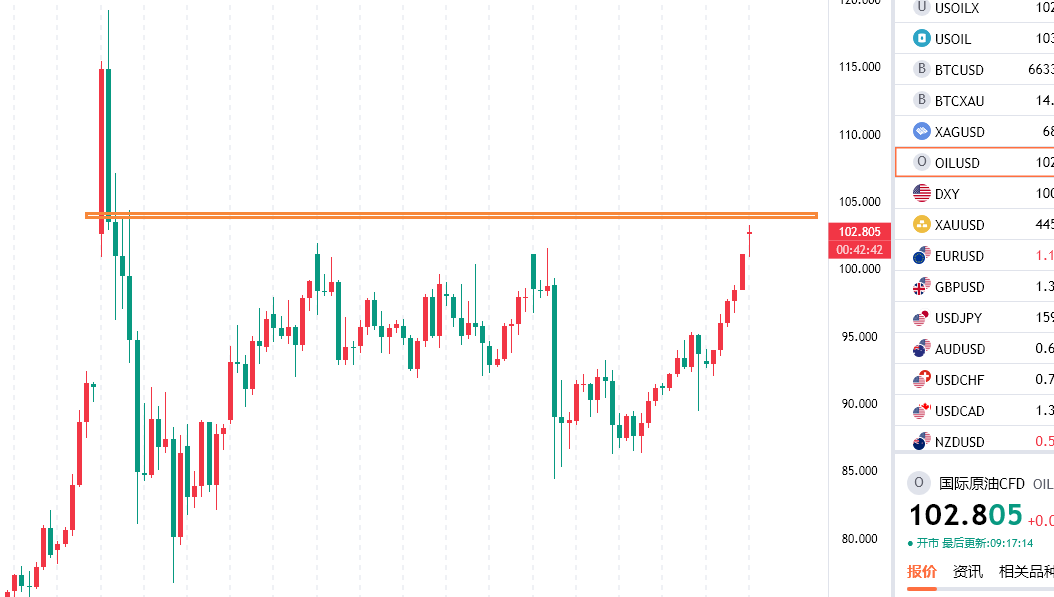 原油方面,由于胡塞武装再度加入战斗,霍尔木兹海峡再度封锁,能源价格的高预期再度支撑原油走高,上周五原油一度从92附近拉伸站上100美元大关,早盘延续拉伸一度触及103一线,技术面上看103/104一线前高是目前分水岭压力位,中东局势目前依旧还是非常紧张,而且有升级的风险,但是这两天在巴基斯坦等国的中间协调之下,美伊之间可能会有谈判出现,市场也担心谈判的结果对市场有大的影响,所以短期更多会谨慎对待,张力就会有限,所以目前原油分水岭压力位先空看看调整,不够分追涨。