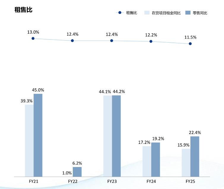 截至2025年末,华润置地自持购物中心租售比录得11.5%,较2024年的12.2%出现一定下滑,其实也录得了2021年以来的低位,2021年的数据为13.0%。