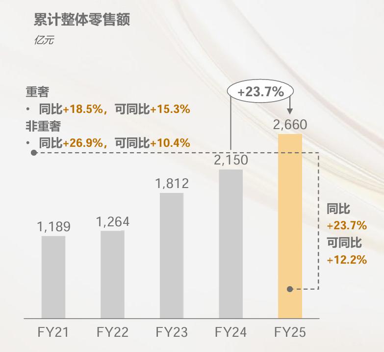 其中,重奢项目零售额同比增长18.5%,可同比增长15.3%;非奢项目同比增长26.9%,可同比增长10.4%。