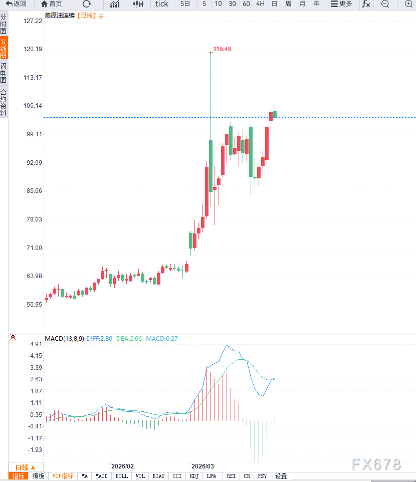 从技术面来看,日线级别上,WTI原油整体仍处于上升趋势之中,但价格在逼近106美元附近后动能有所减弱,短期呈现高位震荡格局。上方关键阻力位关注108美元区域压力(前期结构位)与心理关口附近的抛压,而下方重要支撑位位于100美元整数关口,一旦跌破可能打开进一步调整空间。4小时级别来看,价格已出现明显超买迹象,动能指标逐步回落,短期存在技术性修正需求。若无法有效突破高点区域,油价或进入宽幅震荡区间,波动性显著加大。
