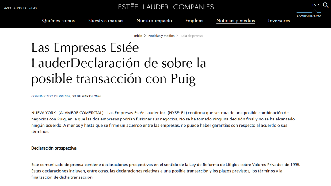 3月23日,雅诗兰黛集团宣布正与西班牙美妆集团Puig就潜在业务合并进行磋商。虽然双方同时强调“尚未做出最终决定,也没有达成任何协议”,仍引发行业热议。