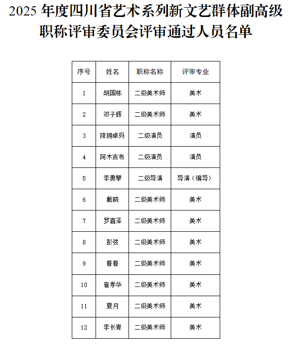 为深入贯彻国家关于新文艺群体职称制度改革部署,回应新文艺群体职称评价需求,2025年,四川省人力资源和社会保障厅牵头,会同四川省文化和旅游厅、四川省文联专题研究推动新文艺群体职称评审工作,并授权省文联组建“四川省艺术系列新文艺群体副高级职称评审委员会”,牵头开展艺术系列演员、导演(编导)、美术3个专业副高级职称评审工作。