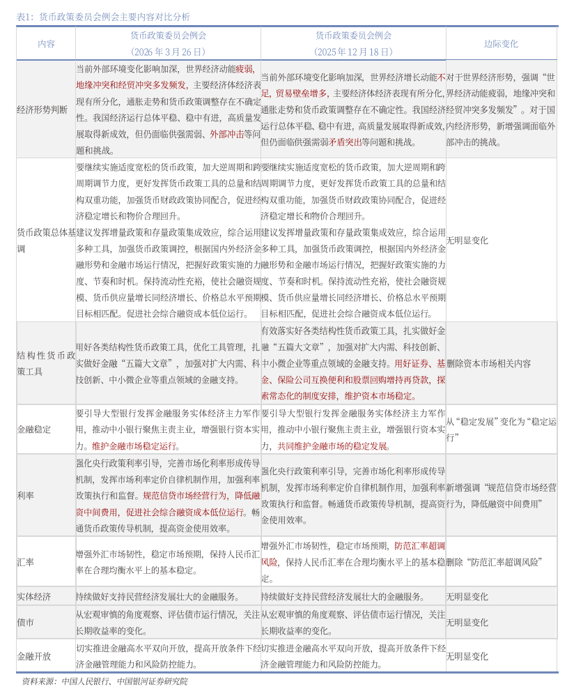 3月26日,中国人民银行货币政策委员会召开2026年第一季度例会。货币政策表述延续中央经济工作会议的定调,上季度相比无显著变化。这表明外部不确定性上升的背景下,中国人民银行“以我为主”,保持政策定力,稳定市场预期。