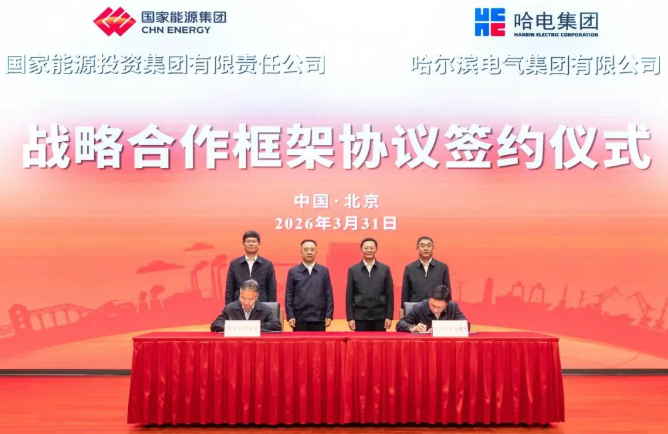 3月31日,国家能源集团与哈电集团在京签署战略合作框架协议。国家能源集团党组书记、董事长邹磊,哈电集团董事长、党委书记黄伟出席签约仪式并见证签约。国家能源集团总经理、党组副书记冯来法,哈电集团总经理、党委副书记刘清勇见签,国家能源集团党组成员、总会计师刘敬山与哈电集团党委常委、副总经理陈辉代表双方签署协议。