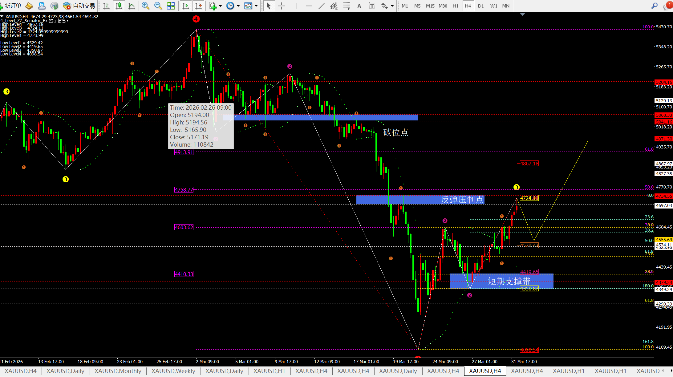 综合而言:日线目前属于大区间震荡逢低做多为主;而4小时和小时线目前冲击4735附近的压制并且是首次,因此可以开启一次空单到4600-4560一线;然后在反手多看4700-4800-4900一线。