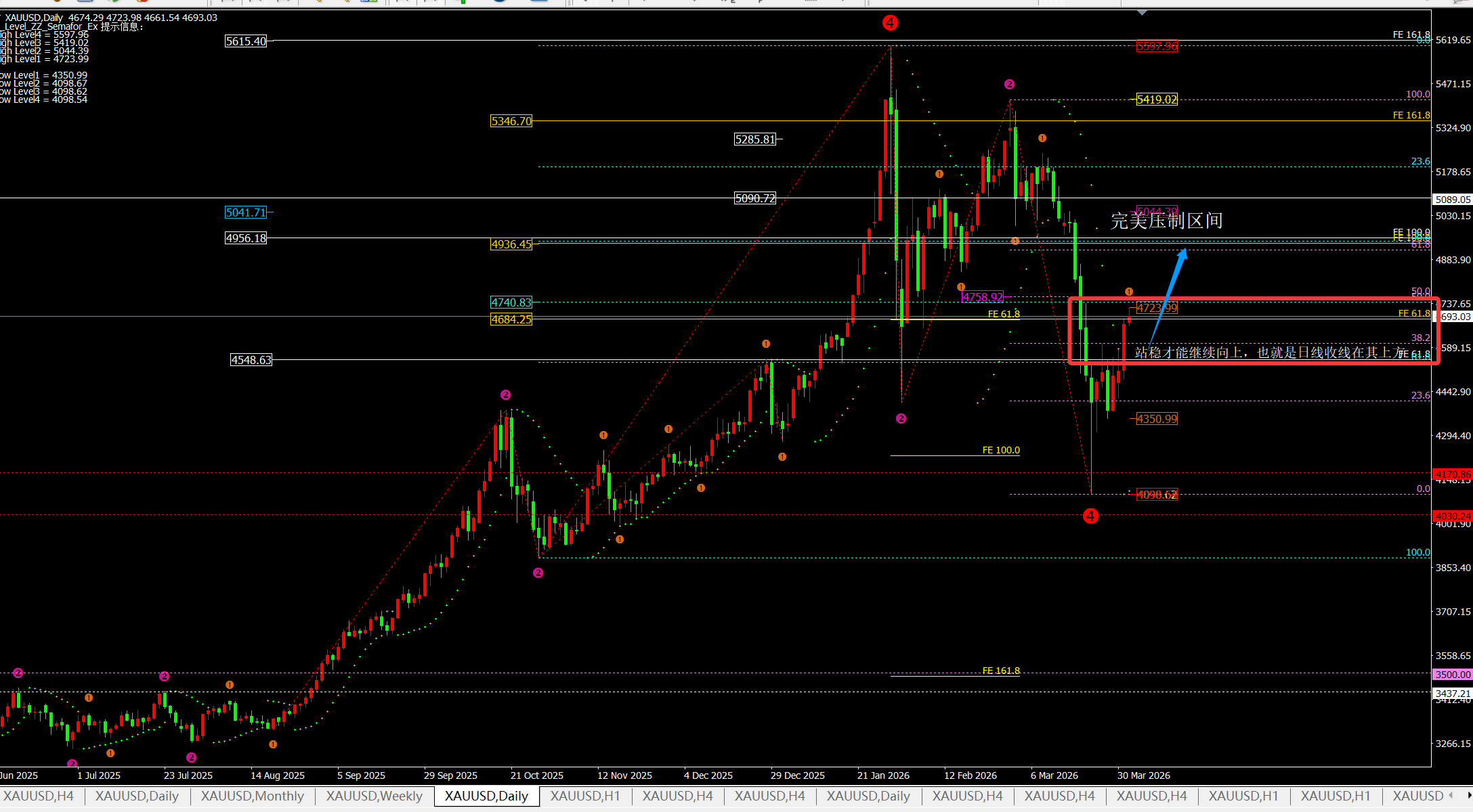 从目前的日线看:天成认为今日区间是4800-4550一线;至于4800上方得明日和周五非农到达。那么从日线的斐波拉契回调线看目前压制在4740-4759一线,支撑于4600和4638-45一线。