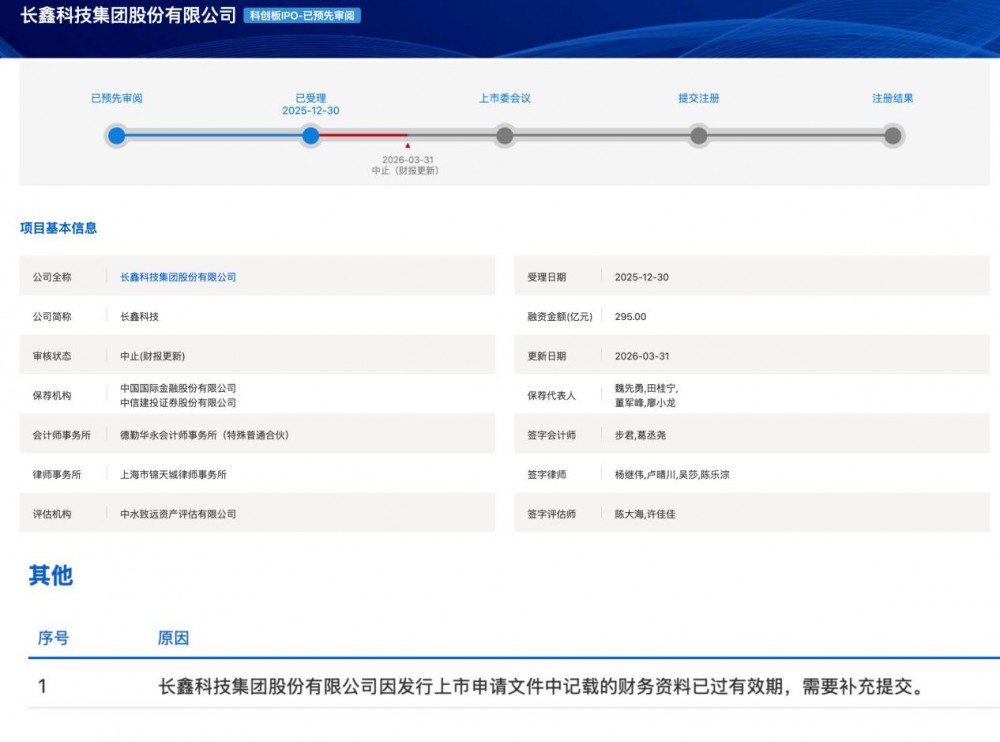 3月31日,上交所官网信息显示,多家企业IPO状态更新,包括:长鑫科技、武汉新芯、蓝箭航天、上海超硅半导体、国仪量子等27家企业IPO审核状态变更为“中止”。第一季度的最后一天,A股IPO项目迎来了批量“中场休息”。