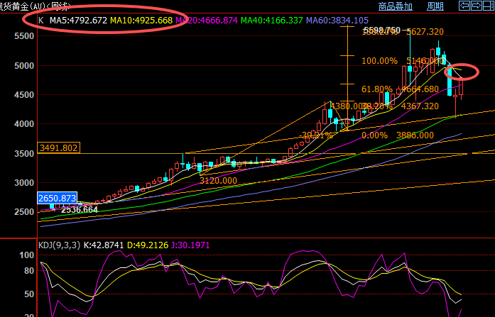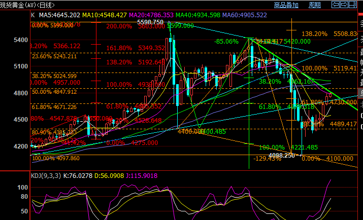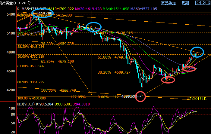 国际黄金,昨天日线收阳,当前四连阳;最近反复强调反弹冲击4730-40以及5和10周线,然后关注再跌。目前4730-40突破,短线强势,正在冲击5周线,且5周线处于刺破状态,当前五周线基本和5420以来短期趋势阻力4795-4800美元区域共振。今天看这个区域阻力压制情况,5周线如不能压制,将冲击10周线;目前10周均线位置基本和4100-5420黄金分割0.618重叠,关注10周线阻力区域再下跌。