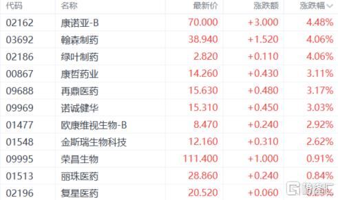 港股方面,康诺亚-B、翰森制药、绿叶制药涨超4%,再鼎医药、金斯瑞生物科技等多股上扬。