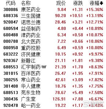 截至发稿,康芝药业涨超15%,益佰制药、津药药业、北大医药、重药控股、济民健康等多股涨停,三生国建、诺思兰德、哈一药业等跟涨。