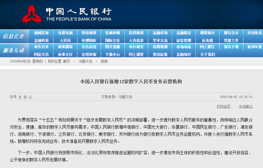 为贯彻落实“十五五”规划纲要关于“稳步发展数字人民币”的决策部署,进一步提升数字人民币服务的普惠性,持续响应人民群众对安全、便捷、高效的数字人民币服务需求,中国人民银行新增中信银行、中国光大银行、华夏银行、中国民生银行、广发银行、浦发银行、浙商银行、宁波银行、江苏银行、北京银行、南京银行、苏州银行成为银行类数字人民币业务运营机构,并接入央行端数字人民币系统。新增机构将在完成业务、技术准备后开展数字人民币业务。