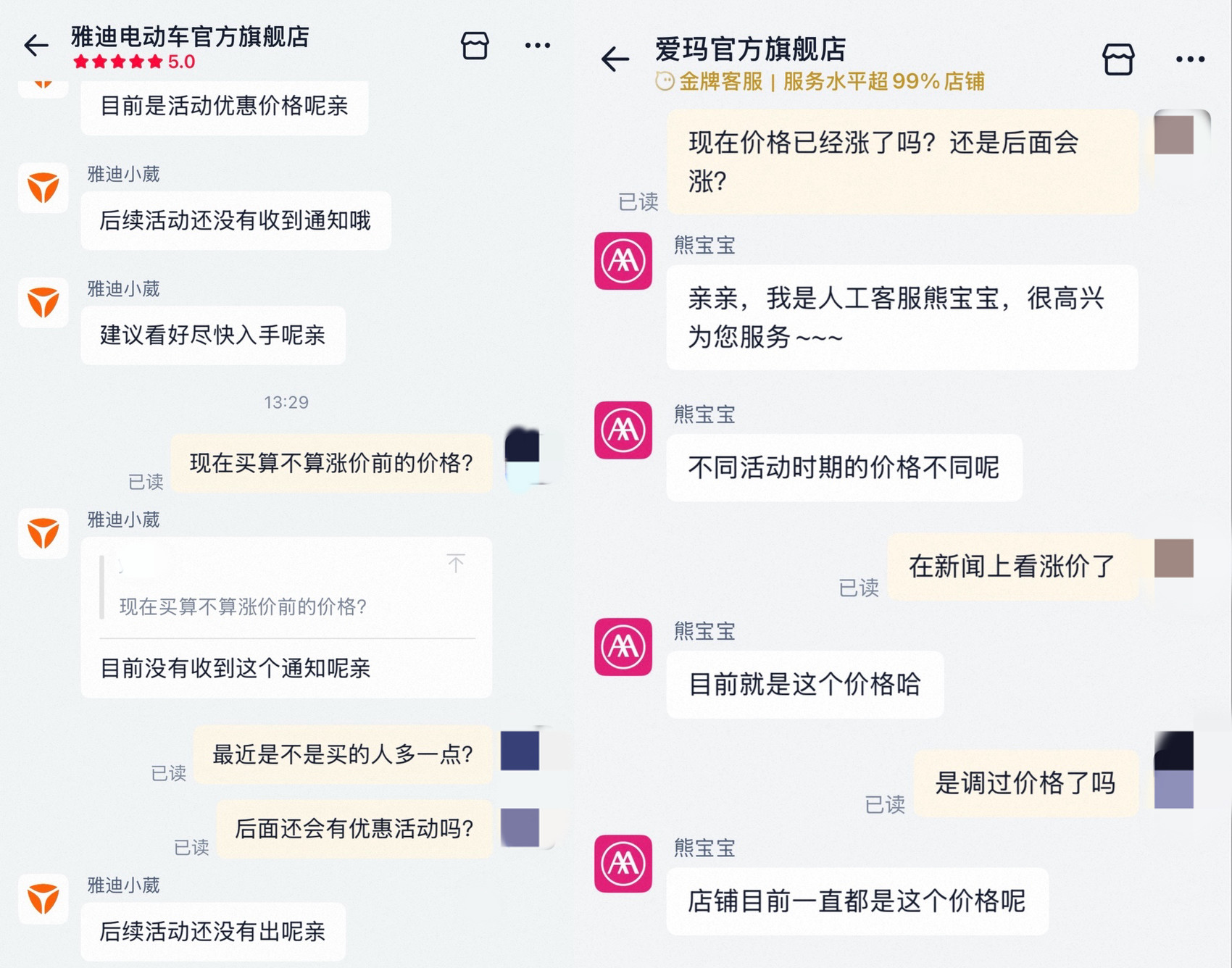 记者在电商平台咨询雅迪、爱玛官方旗舰店客服发现,部分客服仍表示“未收到涨价通知”,或以“不同活动价格不同”回应,尚未明确执行调价。