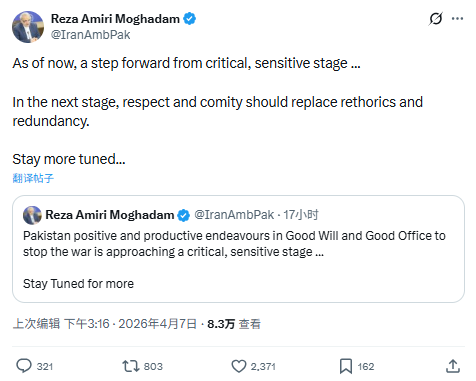 除以色列媒体消息外,伊朗驻巴基斯坦大使的最新表态,也被市场解读为一个微妙但重要的积极信号。