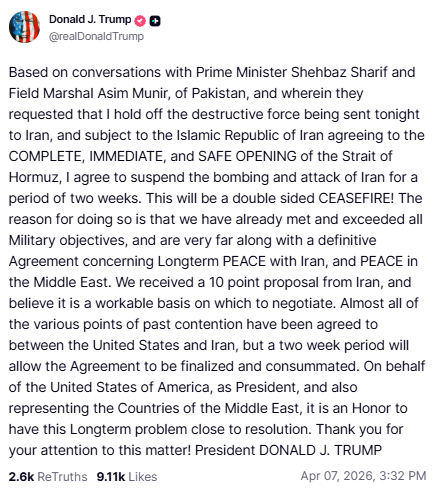 特朗普最新在Truth Social上发文称:“基于与巴基斯坦总理谢里夫和巴基斯坦陆军元帅阿西姆·穆尼尔的会谈,他们请求我今晚不要向伊朗部署破坏性力量,并且以伊朗同意完全、立即且安全地开放霍尔木兹海峡为前提条件,我同意暂停对伊朗的轰炸和攻击,为期两周。这将是一项双向停火!这样做的原因是,我们已经达到甚至超越了所有军事目标,并且在与伊朗达成长期和平协议以及中东和平协议方面取得了重大进展。我们收到了伊朗提出的十点建议,并认为这是一个可行的谈判基础。美国和伊朗之间几乎所有过去的争议点都已达成一致,两周的时间将使协议得以最终敲定和生效。作为美国总统以及代表中东各国,我非常荣幸能在这个长期问题的解决上取得进展。”#伊朗危机追踪#