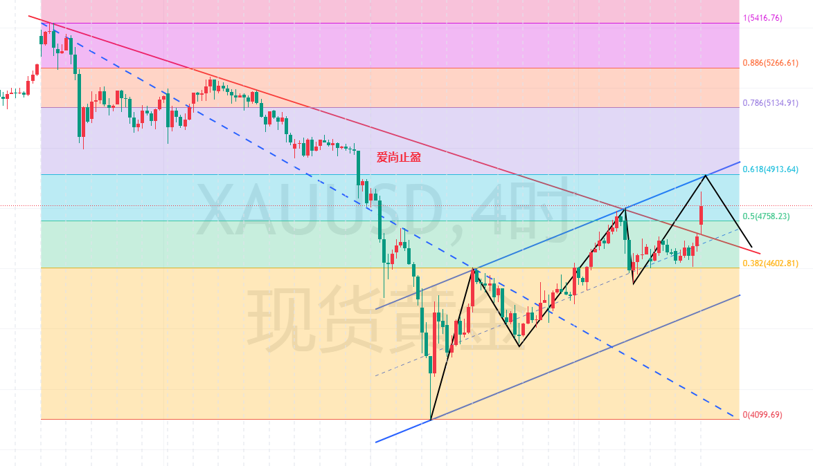 早间,受到美伊停战的影响,致使原油暴跌,黄金直接高开,金价在突破4小时趋势线压制后一路强势上升,当前最高触及4857附近后回落。日内黄金,下方短期支撑关注4800,这个位置是前期的高点,也是早间上涨回撤的382支撑,强支撑关注早间回踩的低点4713,此位也是4小时趋势线的反支撑位,价格在此位之上依旧是多头,上方短期阻力在4855附近,此位是此轮上涨的谐波位,当前触及已经小幅回落,日内强压力关注4915附近,此位是5420-4100回撤反抽的618压力位,也是4小时级别趋势线的压力位,日内黄金如果继续走上升,可以重点关注此位的做空机会,同时,前期内盘积存金如果在此位附近被套的,也可以关注此位附近的解套机会。