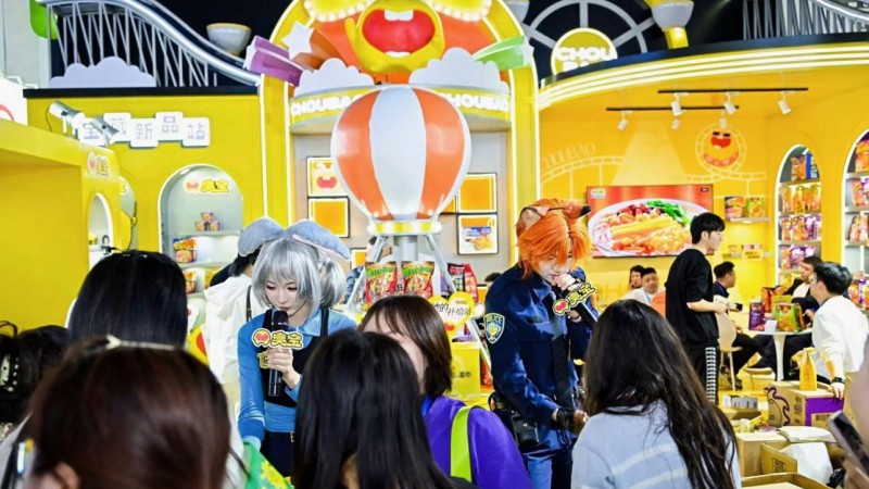 作为螺蛳粉行业的领导品牌,臭宝再度以时尚潮酷的展位设计成为西博城休闲食品展区的焦点。在展位现场,标志性的明亮配色与萌动可爱的臭宝IP形象相得益彰,明亮的视觉语言在一众传统食品品牌中格外抢眼。展位设置了产品陈列区、业务洽谈区、产品试吃区和游戏互动区等多个功能分区,浓郁的螺蛳粉香气吸引了大量观众排队试吃,洽谈区内咨询合作的客商络绎不绝,充分展现出消费复苏背景下大众对螺蛳粉的强劲需求。