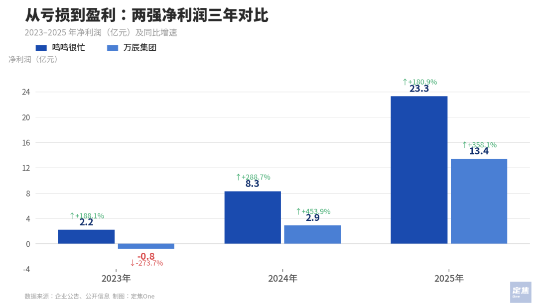 需要指出的是,万辰的净利润增速(358.1%)虽然接近鸣鸣很忙(180.9%)的两倍,但绝对值仍有差距,万辰约为鸣鸣很忙的57%,高增速与2024年基数较低有关。