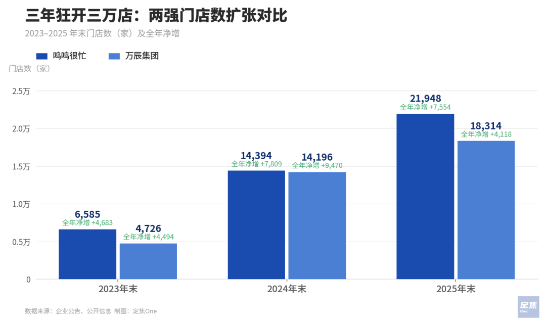 鸣鸣很忙在合并零食很忙、赵一鸣零食后,门店规模一路狂奔:2023年末门店数为6585家,2024年末达14394家,2025年末冲到21948家,全年净增7554家;万辰集团则整合好想来等四大品牌,2024年末门店14196家,2025年末达18314家,全年净增4118家。