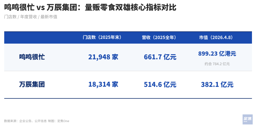 两份财报放在一起看,行业规模还在狂奔。2025年,鸣鸣很忙以21948家门店、661.7亿元营收登顶,万辰集团以18314家门店、514.6亿元营收紧随其后,二者合计占据75.5%市场份额。截至4月8日收盘,鸣鸣很忙市值为784.2亿元,万辰集团为382.11亿元,不足前者一半。