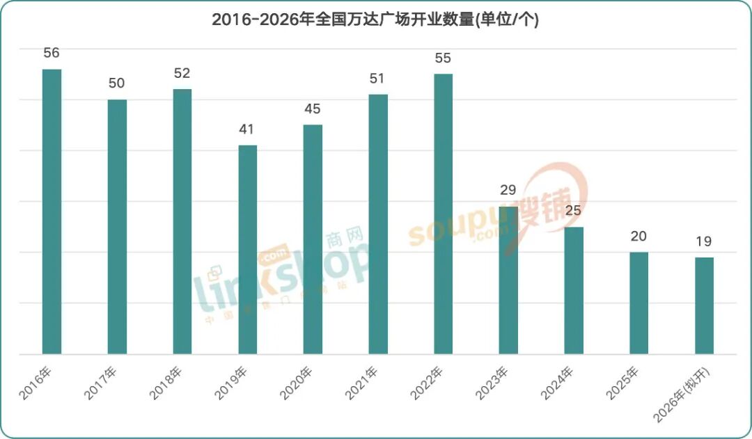 2016~2022年,万达广场处于高速扩张期,年开业数量长期保持在40家以上,重资产开发与全国化布局同步推进。