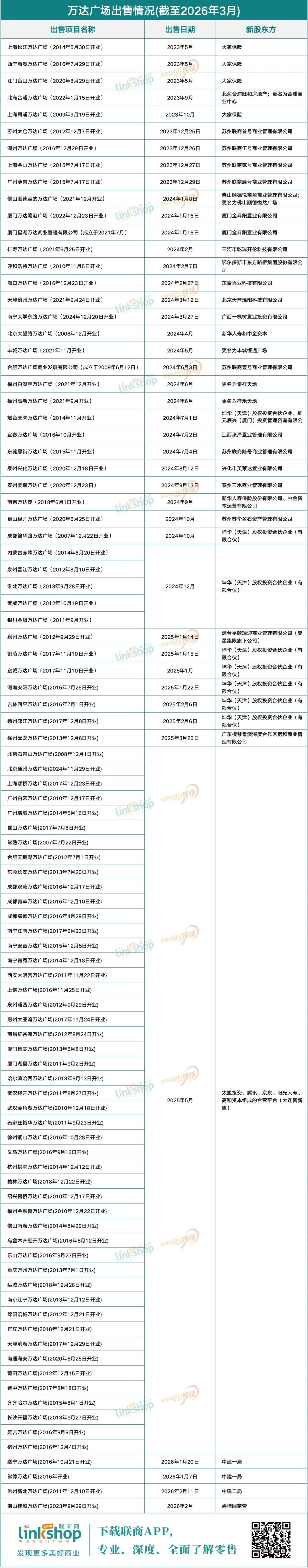 据联商网不完全统计,2023年至今至少有94个万达广场被出售。2026年开年以来,包括常德万达广场、常州新北万达广场、遂宁万达广场、上海颛桥万达广场、佛山桂城万达广场等多个万达广场被出售。
