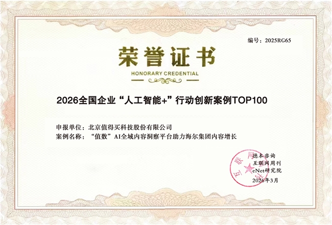 4月8日,中国科学院《互联网周刊》、德本咨询与eNet研究院联合发布《2026全国企业“人工智能+”行动创新案例TOP100》。凭借突出的产业智能化实战效果,值得买科技旗下“值数”平台案例成功入选。2024年以来,值得买科技已连续3年上榜,持续展现出在“AI+消费”领域的场景落地能力和产业化应用成果。