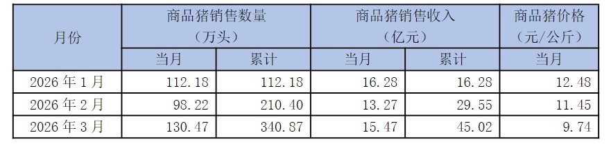 而就龙头来看,同样未能在周期向下过程中独善其身。据温氏股份披露,公司2026年3月销售肉猪368.28万头(含毛猪和鲜品),收入48.28亿元,毛猪销售均价10.11元/公斤,环比变动分别为36.55%、22.04%、-12.99%,同比变动分别为18.97%、-11.27%、-32.01%。2026年3月,公司肉猪销量环比上升,主要是公司前期投苗增加所致;公司毛猪销售均价同比下降,主要是受国内生猪市场行情变化的影响。