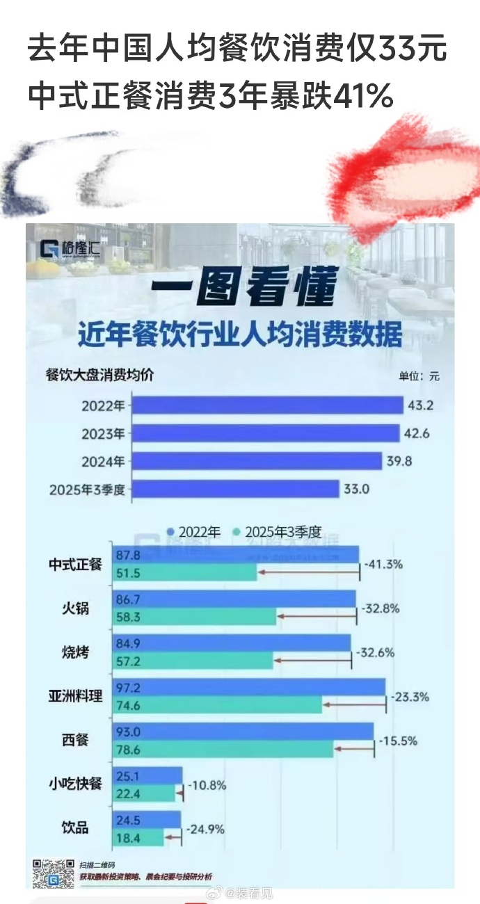 据统计,2025年三季度全国人均餐饮消费仅33元,中式正餐消费三年暴跌41%。我看到这数据的时候,觉得下跌不诧异,但跌幅那么大,还是有点惊到我。