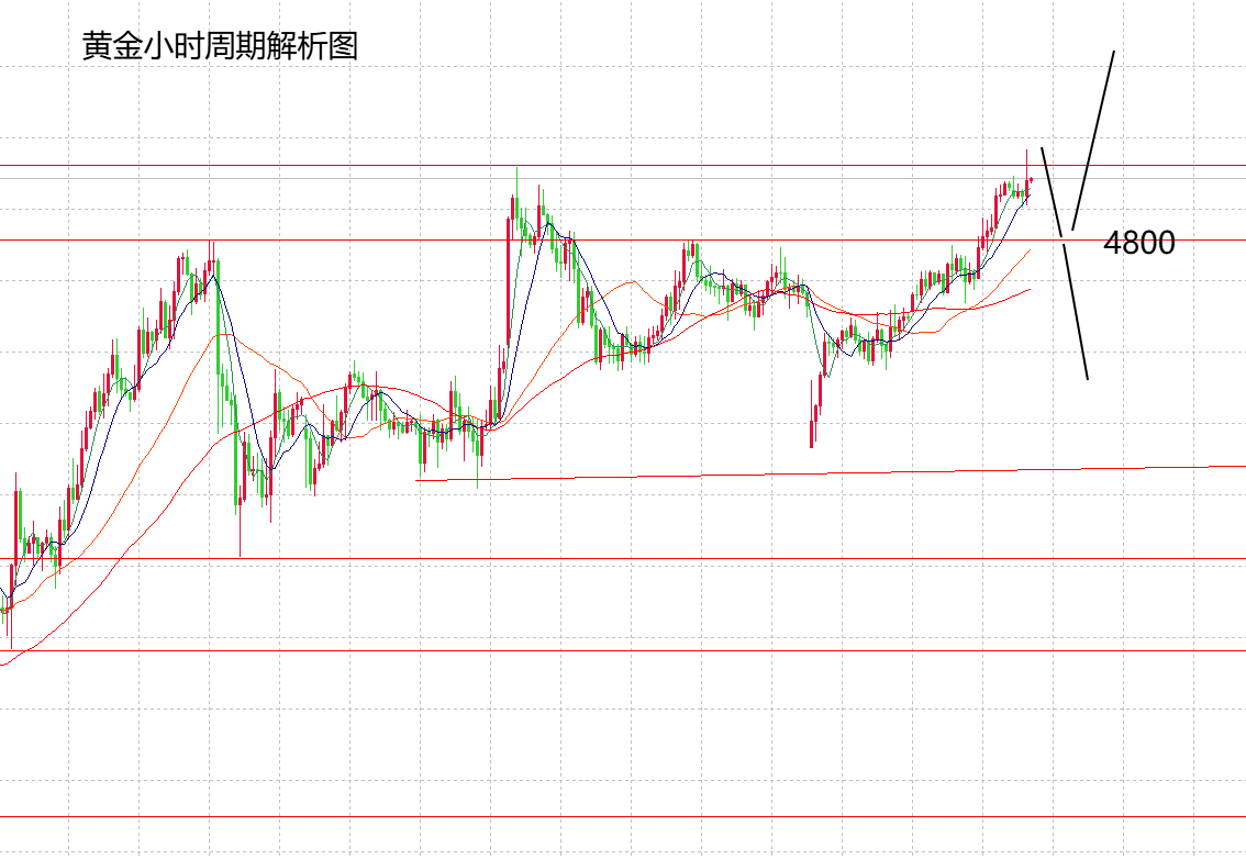 所以今天黄金的走势,没有确定性,虽然暂时强势,但也有可能回落。整体思路就是,在4800以上,继续看上涨,上方重点关注4860和4950这两个点位;如果回落跌破了4800,那黄金就会再次陷入震荡,下方也能看到4750、4700这两个低点。