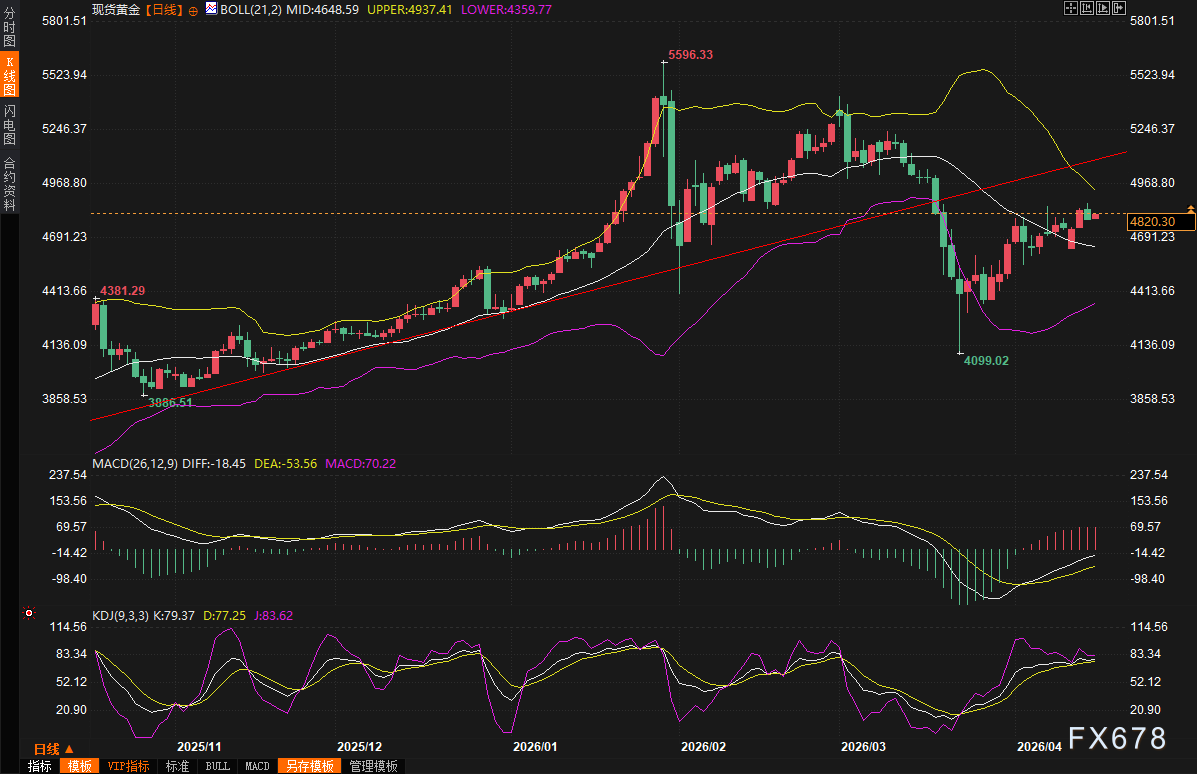 周三(4月15日)现货黄金在触及一个月高点4871.28美元后急速回落,最终收于4790美元附近,单日跌幅接近1%;美国期金也同步下挫0.5%,结算价报4823.60美元。短短24小时内,黄金从避险天堂瞬间变身获利了结的战场,这一切,都源于特朗普口中那句“伊朗战争接近结束”带来的复杂连锁反应。周四(4月16日)亚市早盘,现货黄金小幅上涨,目前交投于4820美元/盎司附近,涨幅约0.6%,美元持续走弱,仍给金价提供支撑。