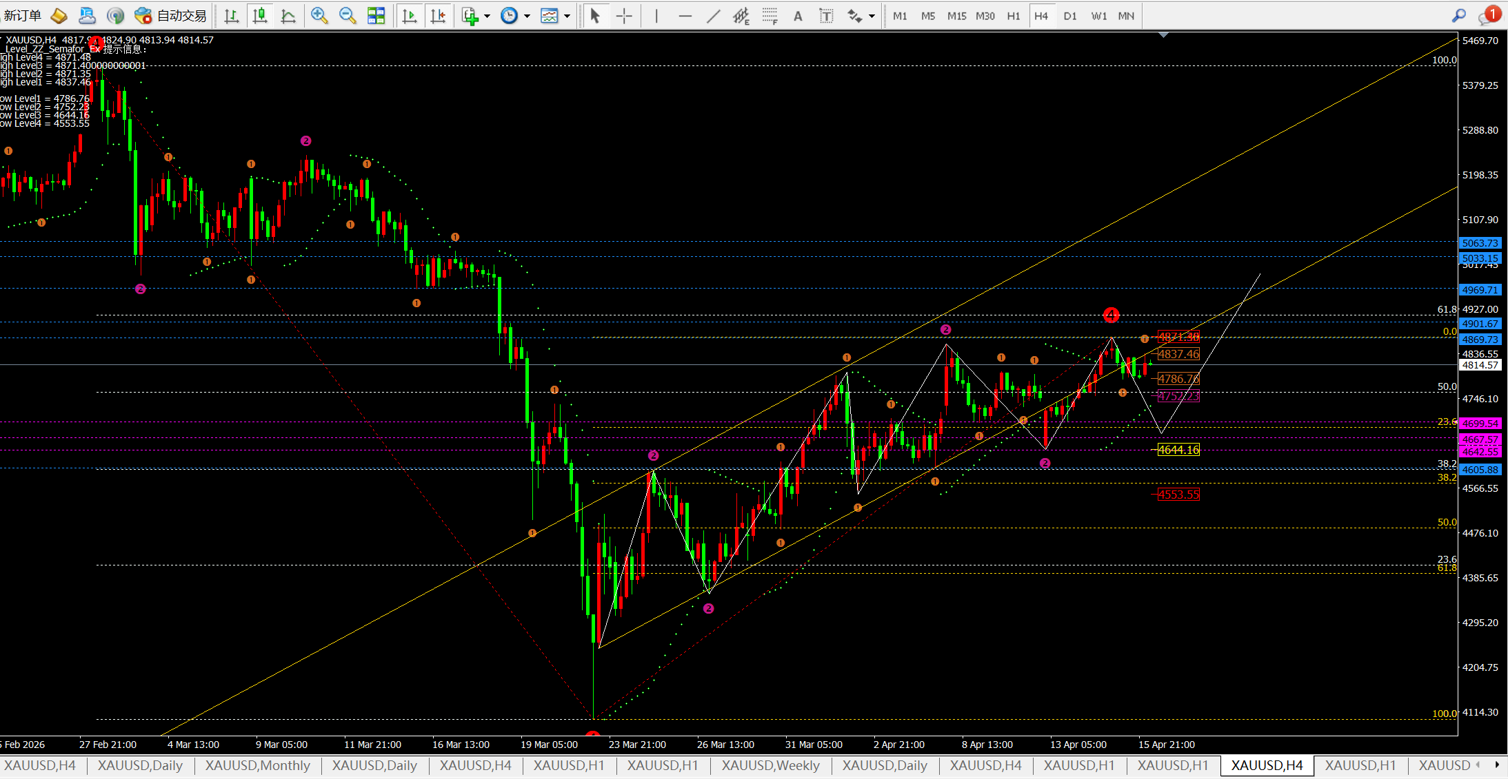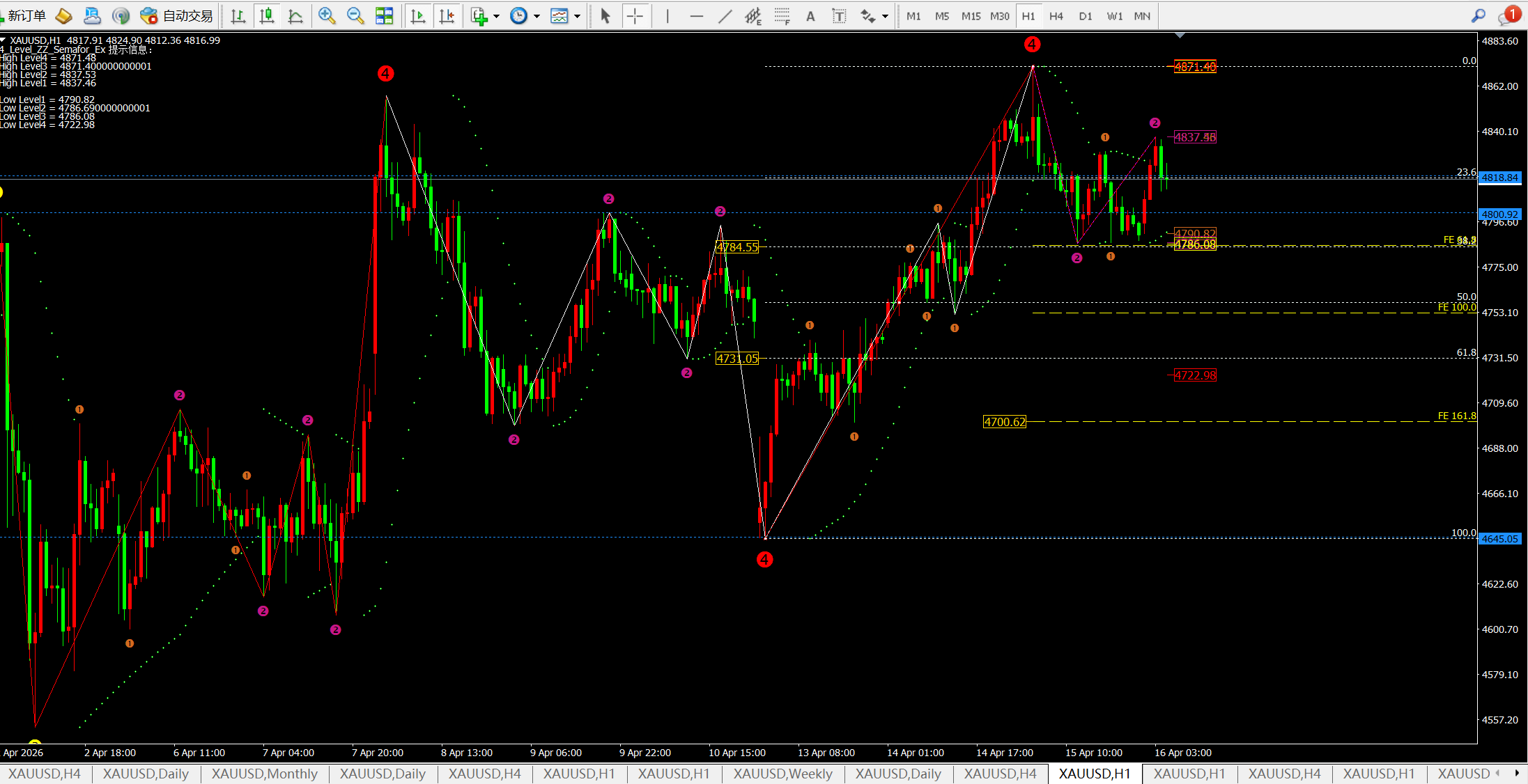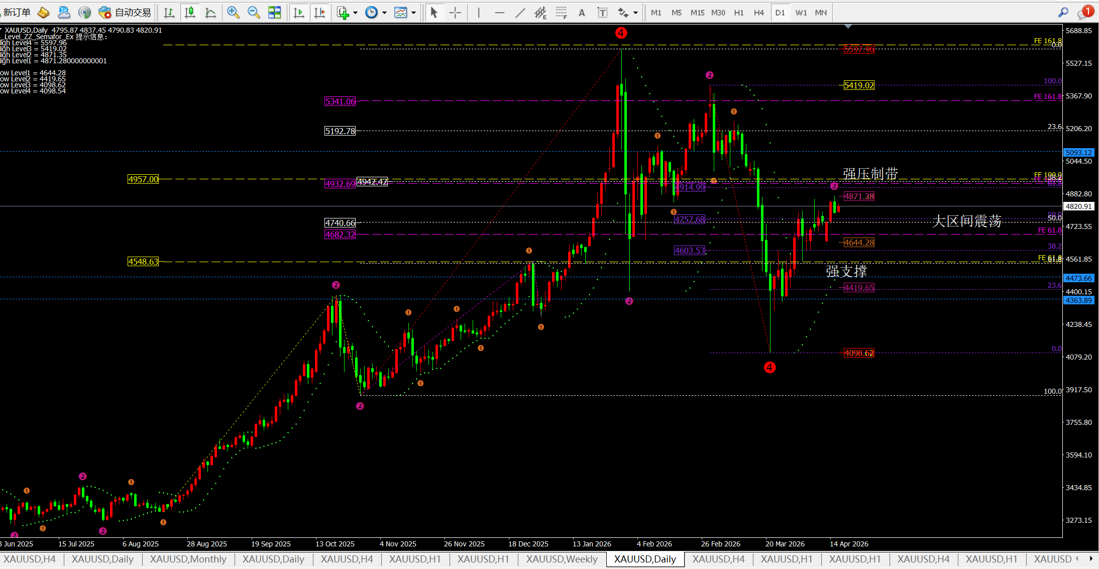 而4小时目前呈现震荡偏强走势并以中轨震荡向上,所以短期我们可判断目前的区间是4780-4850一线。