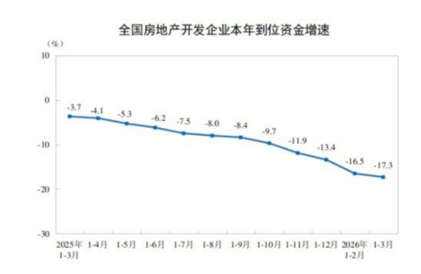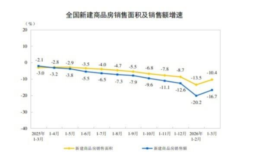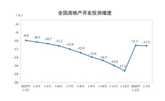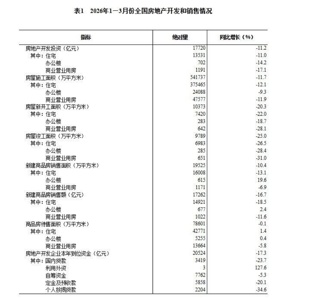 4月16日,国家统计局发布2026年1-3月份全国房地产市场基本情况,中国1-3月份房地产开发投资17720亿元,同比下降11.2%,降幅比1-2月份扩大0.1个百分点;新建商品房销售面积19525万平方米,同比下降10.4%,降幅比1-2月份收窄3.1个百分点;房地产开发企业到位资金20524亿元,同比下降17.3%。