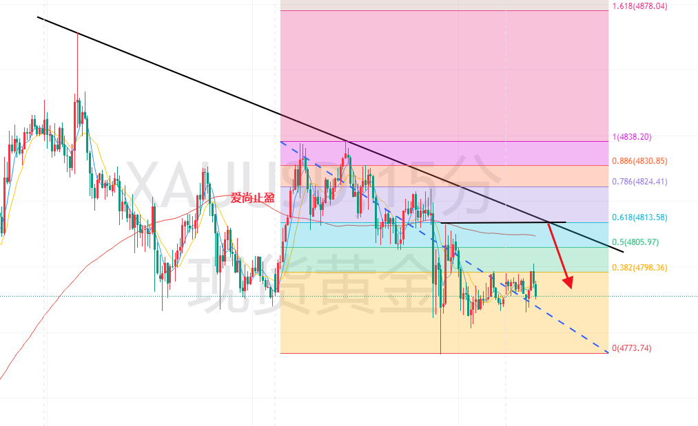 昨天,黄金早间依托日线5日均线走上升,在触及4837后走回落,午后再次走反弹,触及4838附近后再次回落,我们午后的思路是依托618压力看回落,昨天的618压力在4839,但午后价格触及附近后并没有去执行空,因为早间4837已经测试过一次,午后反弹4838,算是二次测试,加上又突破了早间高点,怕多头会延续,所以放弃了这个空单,到了美盘,金价也一直在震荡整理,所以晚间提示继续观望,而美盘黄金,在跌破早间低点4790后延续延续走回落,最低触及4773后反弹整理,日线最终收取一根上影线较长的十字星,这种形态收线,今天的黄金,应该还有回落。
