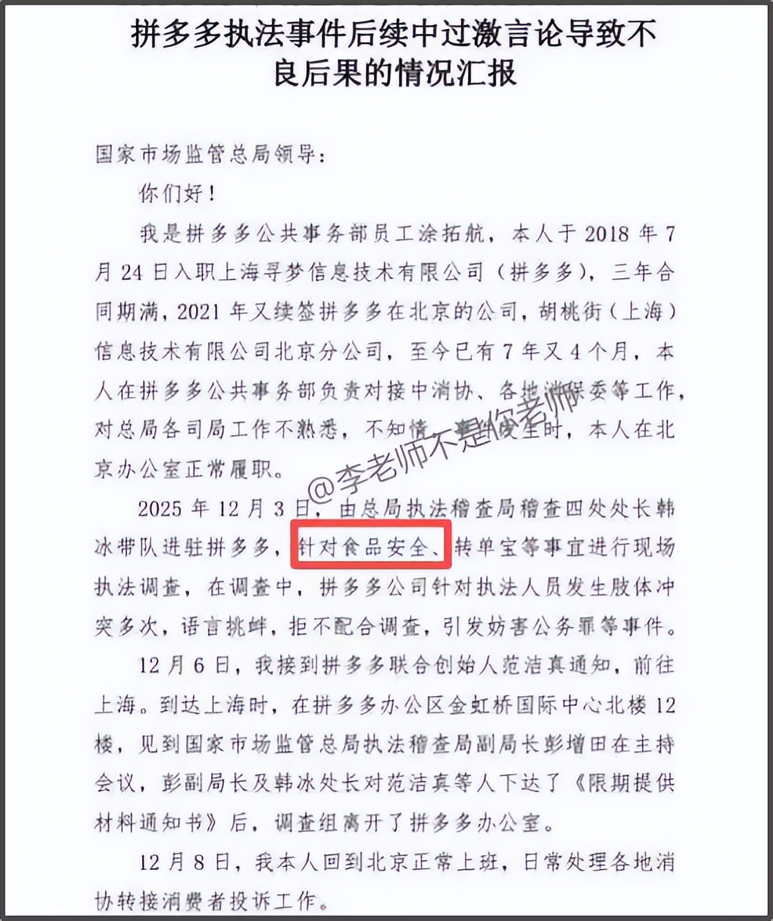 据拼多多前GR负责人此前发布的公开信显示,2025年12月,中国国家市场监管总局执法稽查局曾经进驻拼多多,针对食品安全、转单宝等事宜进行现场执法调查;在调查中,拼多多公司针对执法人员发生肢体冲突多次,语言挑衅,拒不配合调查,引发妨害公务罪等事件。
