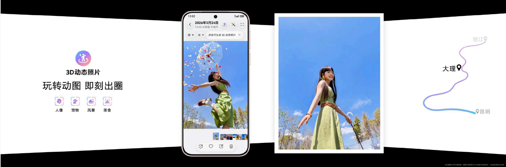 华为Pura 90系列首发的AI姿势推荐功能,彻底改变了人像拍摄体验。内置的海量姿势库,聚焦旅拍Top场景,让用户告别呆板僵硬的“剪刀手”,拍出千姿百态的人像作品。3D动态照片则实现了影像体验从2D向3D的跨越。拍摄一张动态照片,选取高光时刻,即可一键生成具有空间运镜效果的3D动态照片。