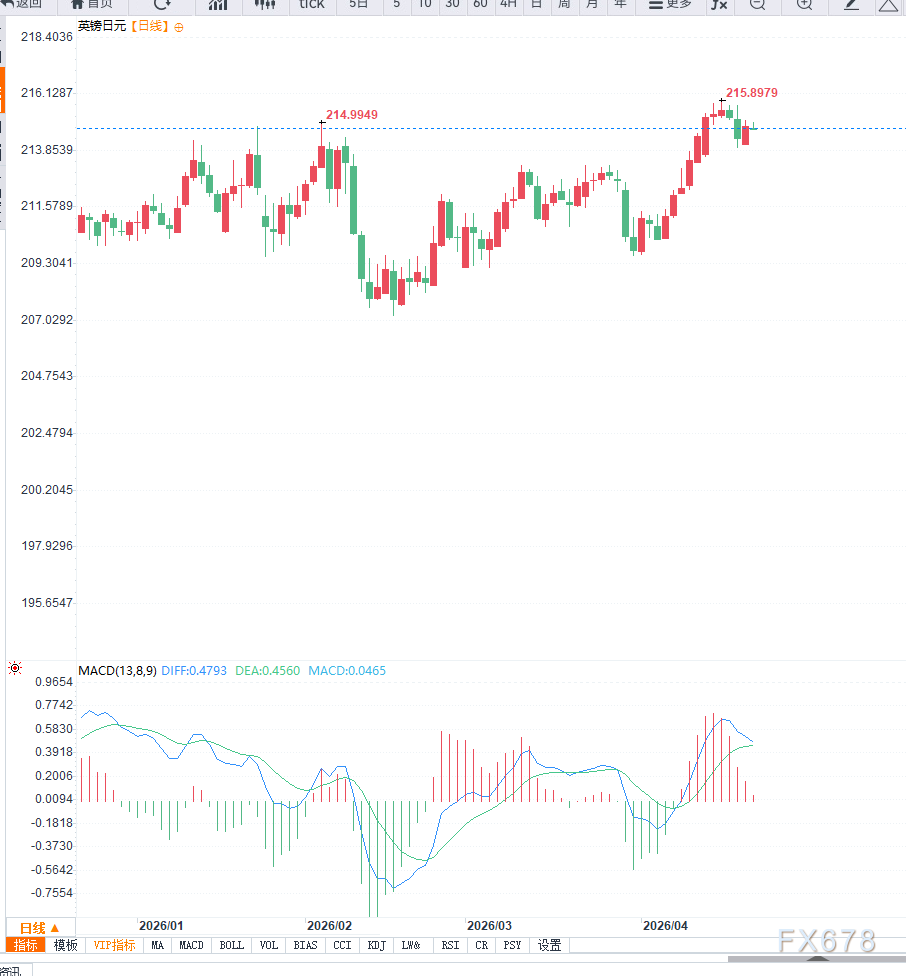 在技术面上,日线级别显示汇价维持在上升趋势中,但上涨节奏明显放缓。215.50附近构成短期阻力,多次测试未能有效突破,显示上方抛压较强。下方来看,214.20为初步支撑,若跌破该位置,可能进一步回落至213.00甚至211.50区域。动能指标方面,MACD高位回落,显示多头动能减弱。